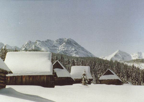 Szałasy na Hali Kopieniec w zimie. W tle Świnica.