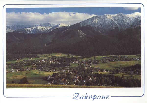 Widok ogólny na Zakopane z Gubałówki. W tle ośnieżone szczyty Tatr. Pod zdjęciem napis: Zakopane.