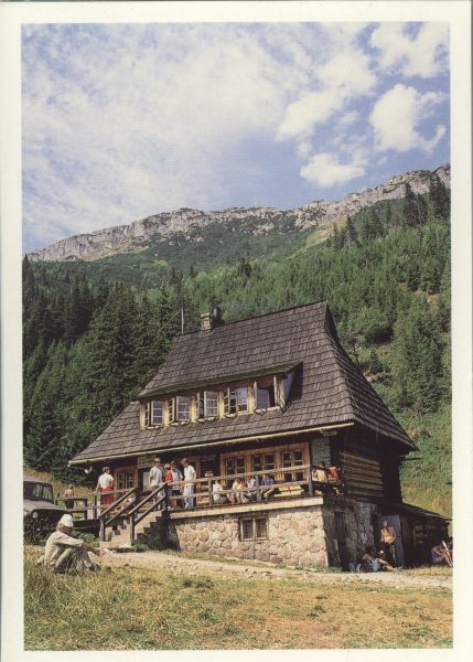 Turyści przed schroniskiem na Hali Kondratowej. W tle Giewont.