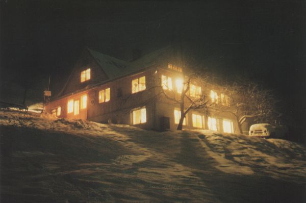 Oświetlone schronisko pod Bereśnikiem nocą w zimie.