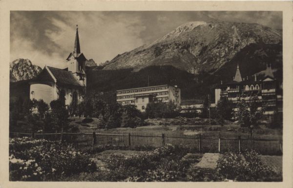 Zabudowania Nowego Smokowca. Po lewej stronie kościół ewangelicki. W tle Sławkowski Szczyt.