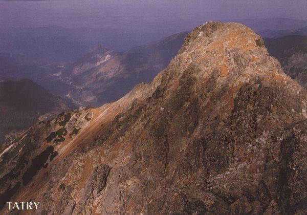 Widok na Żabią Czubę z Rysów. Na dole po lewej stronie napis: TATRY.