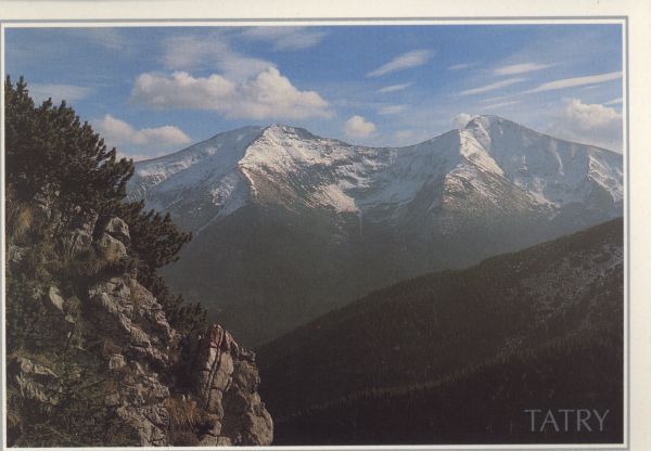 Widok na Smreczyński Wierch i Kamienistą z Kominiarskiego Wierchu. Na dole po prawej stronie napis: TATRY.