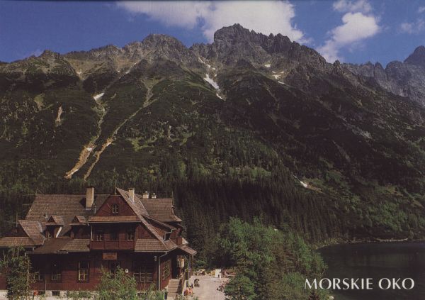 Schronisko nad Morskim Okiem w Dolinie Rybiego Potoku. W tle Żabia Czuba i Niżni Żabi Szczyt. Na dole po prawej stronie napis: MORSKIE OKO.