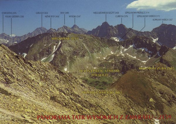 Widok z Zawratu. Pośrodku Miedziane, w tle Gerlach, Rysy, Wysoka, Mięguszowiecki Szczyt Wielki i Koprowy Wierch. W przodzie Walentkowy Wierch. Na dole drukowany tytuł, u góry i po środku nazwy szczytów.