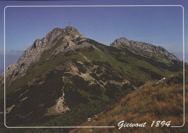 Widok na Giewont od południa. W dole widoczna Kondracka Przełęcz. Na dole po prawej stronie napis: Giewont 1894.