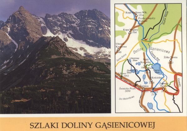 Pocztówka 2. elementowa: Widok z Hali G±sienicowej na Mały Ko¶cielec, Ko¶cielec i ¦winicę. Szkic mapy okolic Doliny G±sienicowej. Na dole nadruk: Szlaki Doliny G±sienicowej.