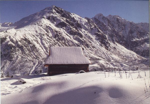 Szałas na Hali G±sienicowej w zimie. W tle Żółta Turnia i Granaty.