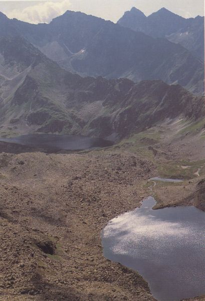 Widok z Zawratu do Doliny Pięciu Stawów Polskich. Z prawej w dole Zadni Staw Polski, pośrodku Czarny Staw Polski. W tle Koprowy Wierch.