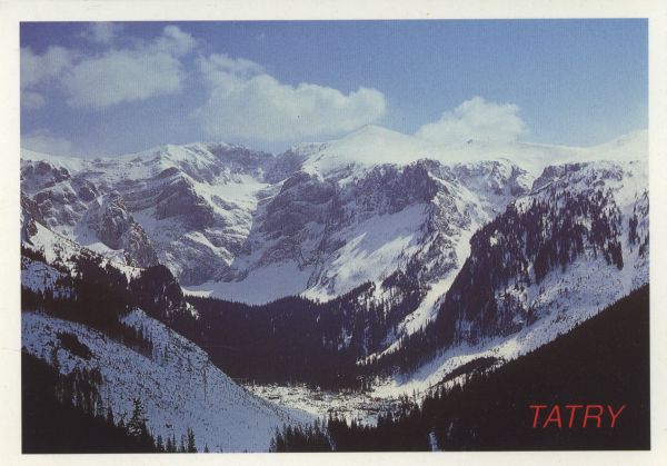 Widok na Czerwone Wierchy w zimie. W dole Dolina Miętusia. Na dole po prawej stronie nadruk: TATRY.
