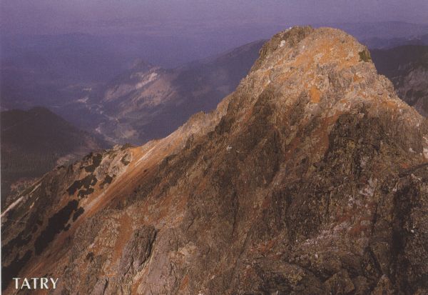 Widok na Żabią Czubę z Rysów. Na dole po lewej stronie napis: TATRY.
