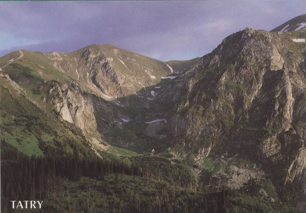 Widok na Kondracką Kopę i Wielką Turnię z Doliny Małej Łąki. Na dole po lewej stronie napis: TATRY.