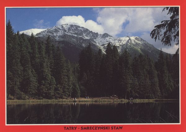 Smreczyński Staw w Dolinie Kościeliskiej. W tle Kominiarski Wierch. Pod zdjęciem napis: TATRY - SMRECZYŃSKI STAW
