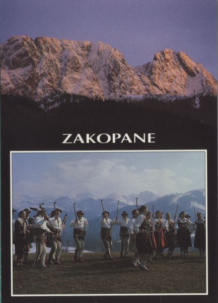 Zespół góralski tańczący na Gubałówce. Pomiędzy zdjęciami napis: ZAKOPANE.