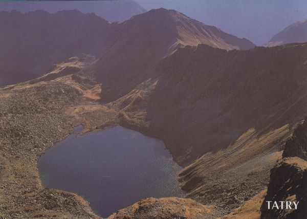 Widok na Zadni Staw Polski z Zawratu. Nad nim w tle Gładki Wierch. Na dole po prawej stronie nadruk: TATRY.