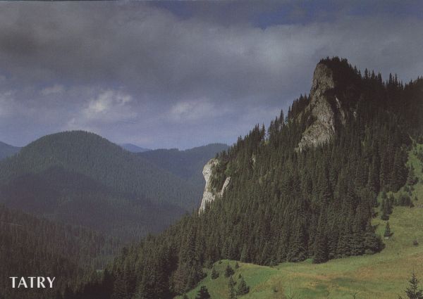 Zawiesista Turnia nad Przysłopem Miętusim. Na dole po lewej stronie napis: TATRY.