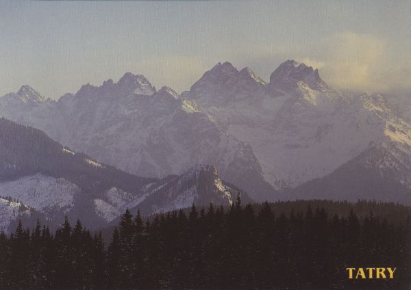 TATRY. TATRA MOUNTAINS. Fragment panoramy Tatr z Głodówki: Ganek, Wysoka, Rysy.