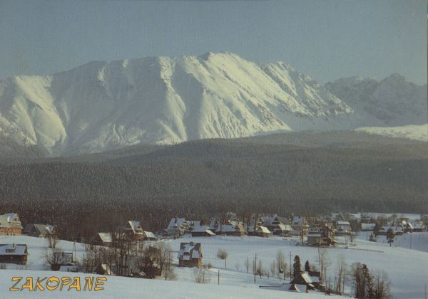 Widok na Koszystą znad Zakopanego w zimie. Na dole po lewej stronie napis: ZAKOPANE.