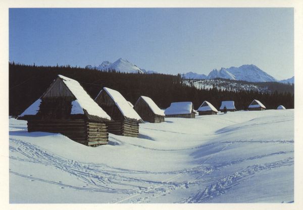 Szałasy na Hali Kopieniec w zimie. W tle Żółta Turnia i Świnica.
