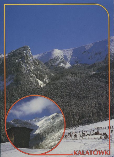 Pocztówka 2. elementowa: Widok z Polany Kalatówki zima na Zawracik Kasprowy, w dole na polanie narciarze. Hotel górski na Kalatówkach. Na dole po prawej stronie nadruk: KALATÓWKI.