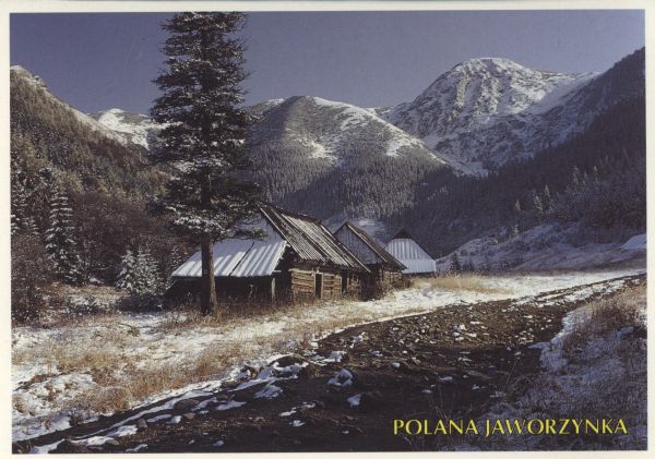 Szałasy na Polanie Jaworzynka. W tle Kopa Magury. Na dole po prawej stronie nadruk: POLANA JAWORZYNKA.