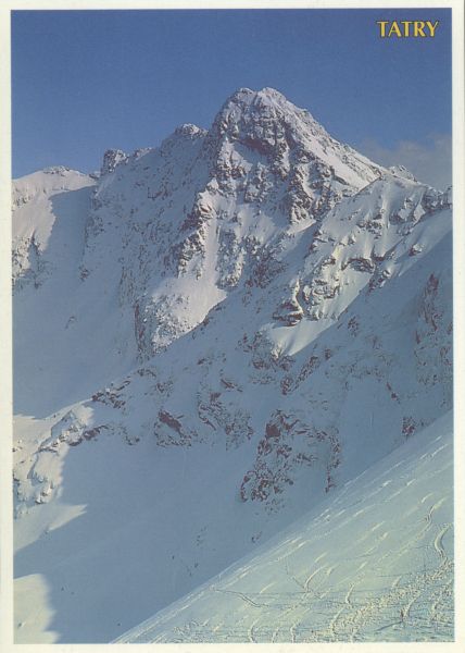 Widok z Kasprowego Wierchu na Świnicę w zimie. W dole z prawej stok narciarski. U góry po prawej stronie nadruk: TATRY.