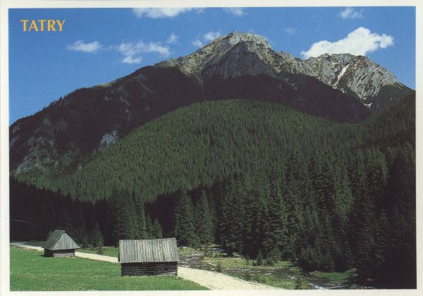 Szałasy na Polanie Chochołowskiej. W tle Kominiarski Wierch. U góry po lewej stronie napis: TATRY.