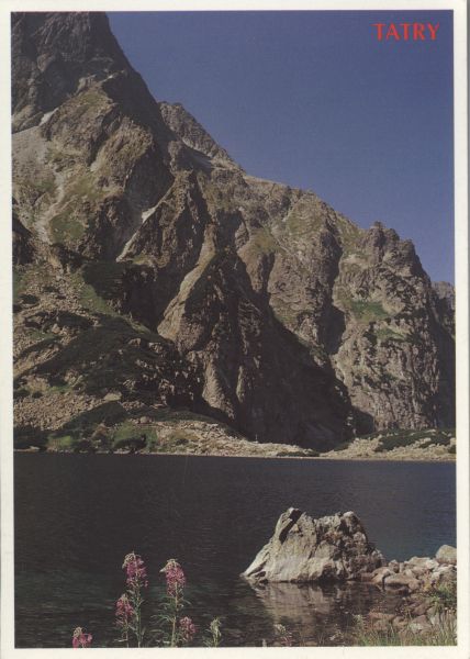 Czarny Staw pod Rysami. W tle filar Mięguszowieckiego Szczytu Wielkiego. U góry po prawej stronie napis: TATRY.