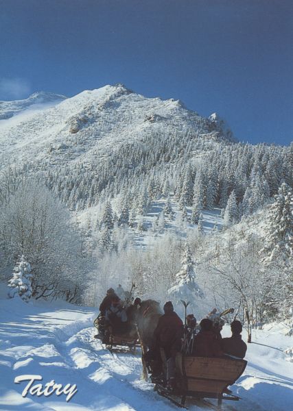 Sanie z turystami na drodze na Kalatówki w zimie. W tle Kalacka Turnia. Na dole nadruk: TATRY.