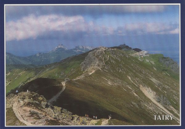 Widok na Kasprowy Wierch i Giewont z Beskidu. Na dole po prawej stronie napis: TATRY.
