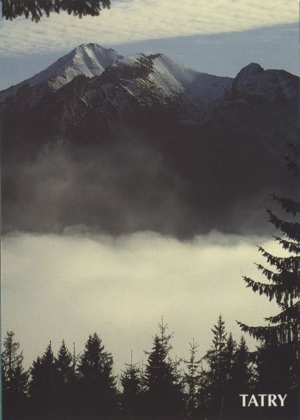 Widok z Gęsiej Szyi na Tatry Bielskie (Nowy Wierch, Hawrań i Murań). Na dole po prawej stronie napis: TATRY.