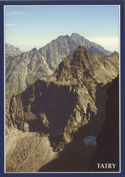 Widok z Rysów na Ganek i Galerię Gankową. W tle Gerlach. Na dole po prawej stronie nadruk: TATRY.