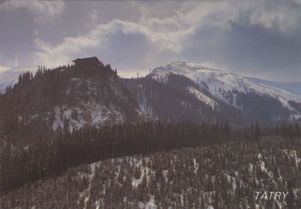 Stacja przesiadkowa kolei linowej na Myślenickich Turniach. W tle Kasprowy Wierch zimą. Na dole po prawej stronie napis: TATRY.