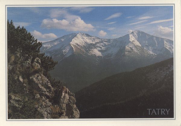Widok na Smreczyński Wierch i Kamienistą od północy. Na dole po prawej stronie napis: TATRY.