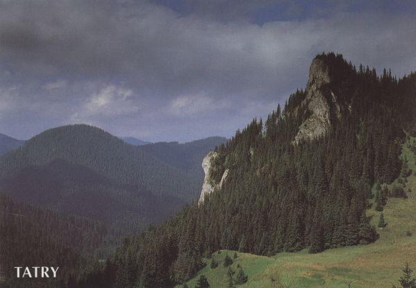 Zawiesista Turnia nad Przysłopem Miętusim. Na dole po lewej stronie napis: TATRY.