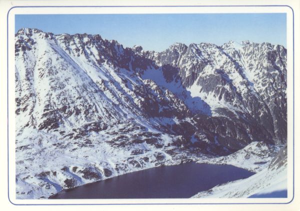 Widok do Doliny Pięciu Stawów Polskich w zimie. W dole Wielki Staw Polski. W tle Kozi Wierch, Granaty i Krzyżne.