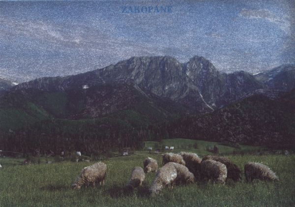 Widok na Giewont z Gubałówki. Na pierwszym planie pasą się owce.
