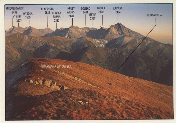 Widok od Tomanowego Wierchu Liptowskiego w stronę Tatr Wysokich i Krywania. U góry drukowane nazwy szczytów i ich wysokość n.p.m.