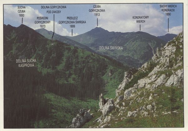 Widok z Zawratu Kasprowego w kierunku południowo - zachodnim. U góry drukowane nazwy szczytów.