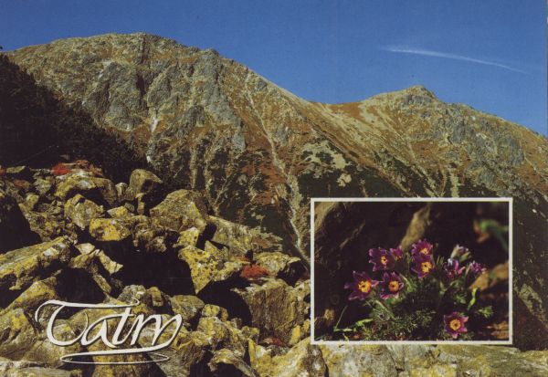 Pocztówka 2. elementowa: Opalony Wierch i Miedziane nad Doliną Rybiego Potoku. Sasanka słowacka (Pulsatilla slavica G. Reuss). Na dole po prawej stronie napis: Tatry.
