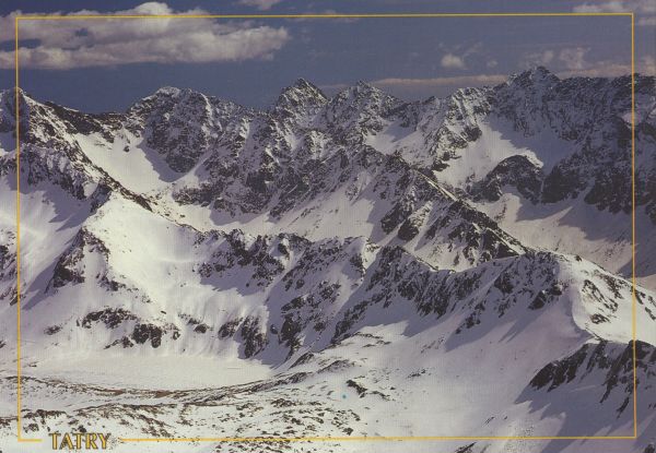 Widok ze Świnicy na południe w zimie. W dole Dolina Pięciu Stawów Polskich. W tle Koprowy Wierch i Hruby Wierch. Na dole po lewej stronie napis: TATRY.