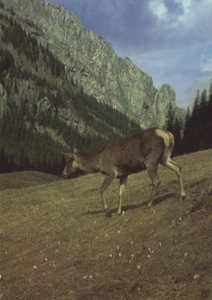 Łania (Cervus elaphus) na Polanie Smytniej w Dolinie Kościeliskiej. W tle Raptawicka Turnia.