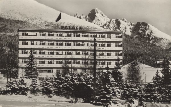 Na pierwszym planie budynek Palace (Pałac). W tle ośnieżona Łomnica.
