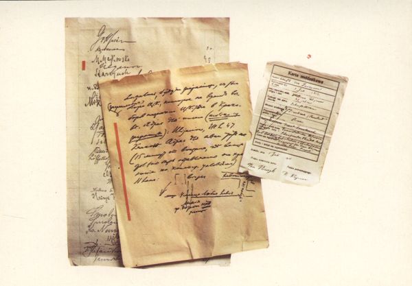 Dokumenty związane z pobytem Włodzimierza Lenina na polskiej ziemi: fragment listu Lenina z naszkicowanym planem trasy z dworca na ul. Lubomirskiego w Krakowie, karta meldunkowa. Faksymilia ze zbiorów Muzeum Lenina w Warszawie.