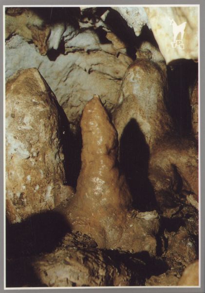 Stalagminty w Jaskini Mroźnej w Dolinie Kościeliskiej. Dodatkowo znak graficzny TPN.