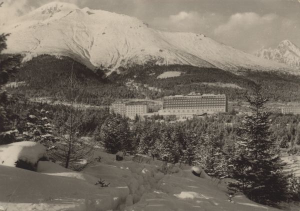Widok na budynki sanatoryjne w Nowem Smokowcu w zimowej scenerii. W tle Sławkowski Szczyt. Po prawej Łomnica.