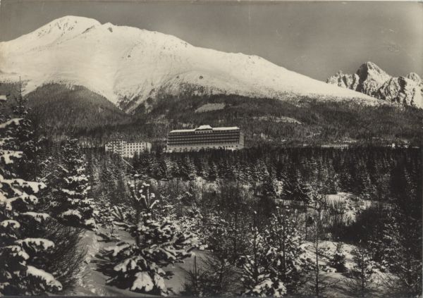 W głębi widać budynki sanatorium w miejscowości Nowy Smokowiec w zimowej scenerii. W tle po lewej Sławkowski Szczyt, po prawej Łomnica.