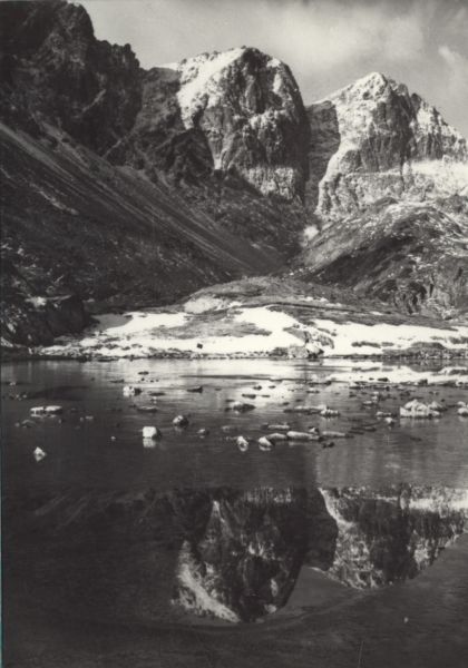 Tatry Wysokie. Widok z Doliny Staroleśnej na Baniastą Turnię i Małą Wysoką. Tytuł również w języku: niem., ang., fr.