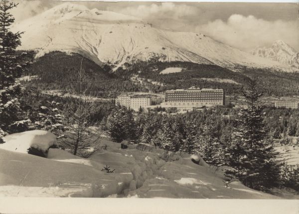 Widok na budynki sanatoryjne w Nowym Smokowcu w zimowej scenerii. W tle Sławkowski Szczyt. Po prawej Łomnica.
