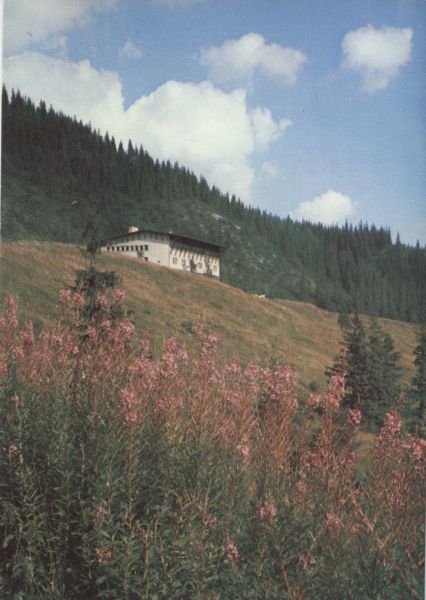 Schronisko PTTK na Kalatówkach, na pierwszym planie wierzbówka kiprzyca (Chamerion angustifolium).